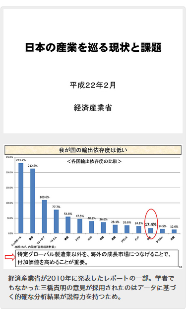 実際、「日本は輸出依存国だ」と日本全体が思い込んでいた頃、三橋貴明が「日本の成長が輸出依存ではなく、内需によってもらたされた」ことを経済産業省で解説したところ、経済産業省が2010年に「我が国の輸出依存度は低い」という新たなデータを発表するにいたりました。