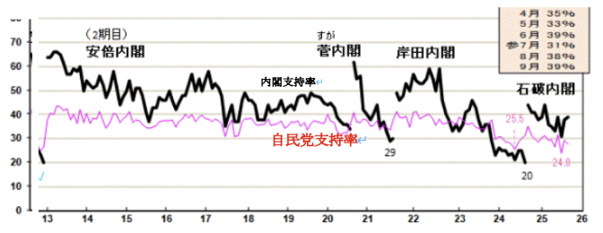 多くの自民党員はもちろんのこと、全国の国民もまた、この石破総裁誕生を促した岸田氏を中心とした「党利党略・私利私欲」丸出しの自民国会議員団の振る舞いを民意に対する「裏切り」と捉えました。結果、岸田内閣下で、それまで40%前後を推移していた自民党の支持率が、30%を割り込むまでに下落しました。